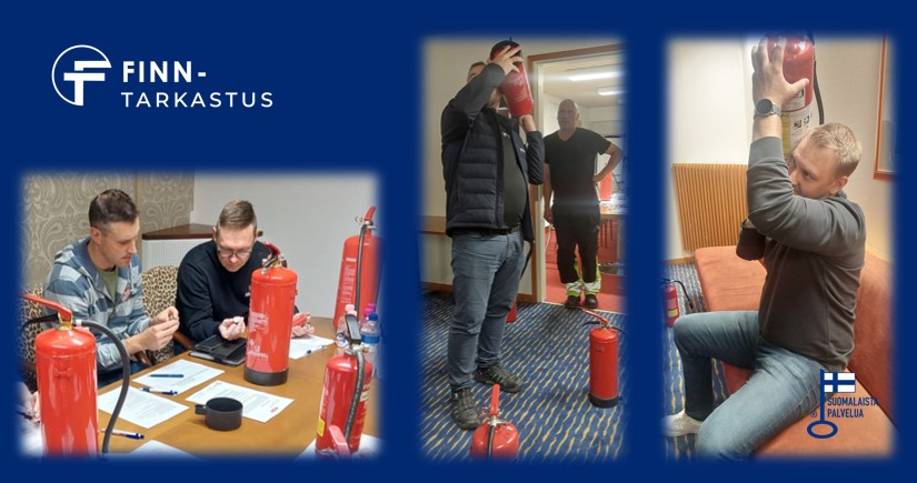 Kaikilla nostolaitetarkastajillamme on nyt pätevyys myös käsisammuttimien tarkastukseen, joten muistathan jatkossa kysyä meiltä myös sammutintarkastuksia! Kuvissa harjoitellaan jauhesammuttimen tarkastusta Kai Pekanderin (keskimmäinen kuva oikealla) valvovan silmän alla.