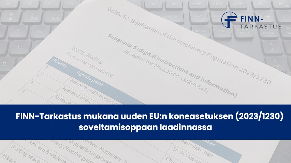 Uuden EU:n koneasetuksen (2023/1230) soveltamisoppaan laadinta on alkanut - lue lisää FINN-Tarkastuksen osallistumisesta soveltamisoppaan laadintatyöhön nettisivujemme uutisosiosta!